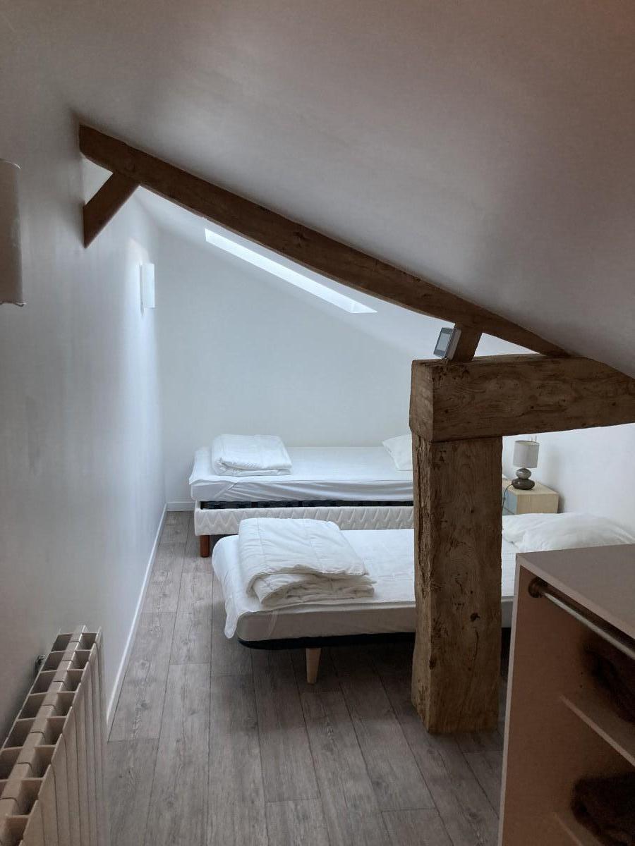Il comprend en rez de chaussé une chambre avec un lit double(160cm par 200cm), et une chambre mansardée avec 2 lits simple 90 cm par 200 cm à l'étage .